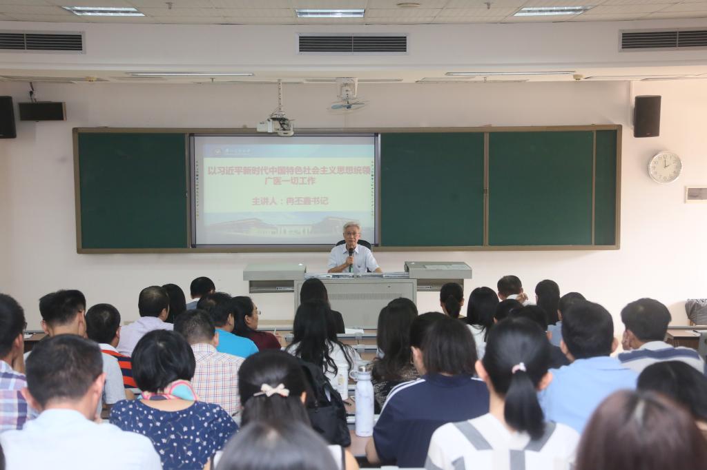 随后,冉书记紧密结合学校发展现况,指出学校各项工作要以习近平新时代中国特色社会主义思想为统领,特别是指导高水平大学建设工作,并就此从三个方面进行了深刻论述:一是“打铁还需自身硬”,必须要抓好党的建设,发挥基层组织的战斗堡垒作用,毫不动摇坚持和完善党的领导,毫不动摇把党建设得更加坚强有力,办好中国特色社会主义大学;二是“用两条腿走路”,既要贯彻全国教育大会精神,坚持以本为本,推进“四个回归”,扎实做好本科教育,同时不断提高学科水平和人才队伍质量;三是落实好立德树人根本任务,争做“四有好老师”,当好“四个引路人”,坚守“四个相统一”,使学生将个人理想与国家发展、中华民族伟大梦想结合起来,培养出有本事、会做人的“广医人”。