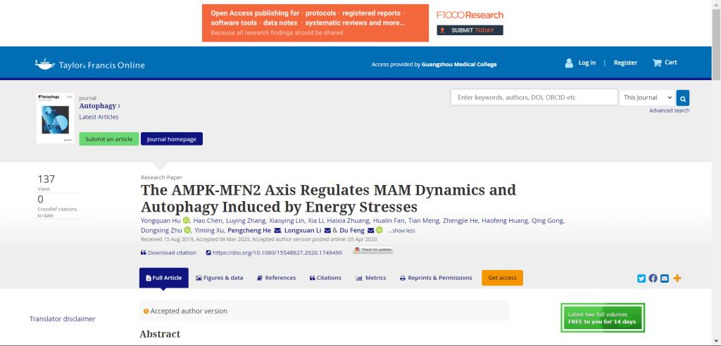 蛋白质修饰与降解广东省重点实验室冯杜教授领衔的自噬研究团队,在《Autophagy》(2018 IF:11.059)发表题为“The AMPK-MFN2 Axis Regulates MAM Dynamics and Autophagy Induced by Energy Stresses”的研究论文。该研究发现介导线粒体融合的蛋白MFN2与细胞能量感受器AMPK之间存在相互作用,并进一步研究了AMPK-MFN2互作在线粒体呼吸链受到胁迫下,细胞启动自噬以及线粒体相关内质网膜结构区域(Mitochondrial-associated Membranes,MAMs)发生动态变化的机理。细胞器膜接触(Membrane Contacts)为细胞器之间搭建桥梁,建立通讯,行使功能。目前这一领域已成为国际热点,为此,国家自然科学基金委会专门启动了“细胞器互作网络及其功能研究重大研究计划”,以确立我国在这个领域的地位。