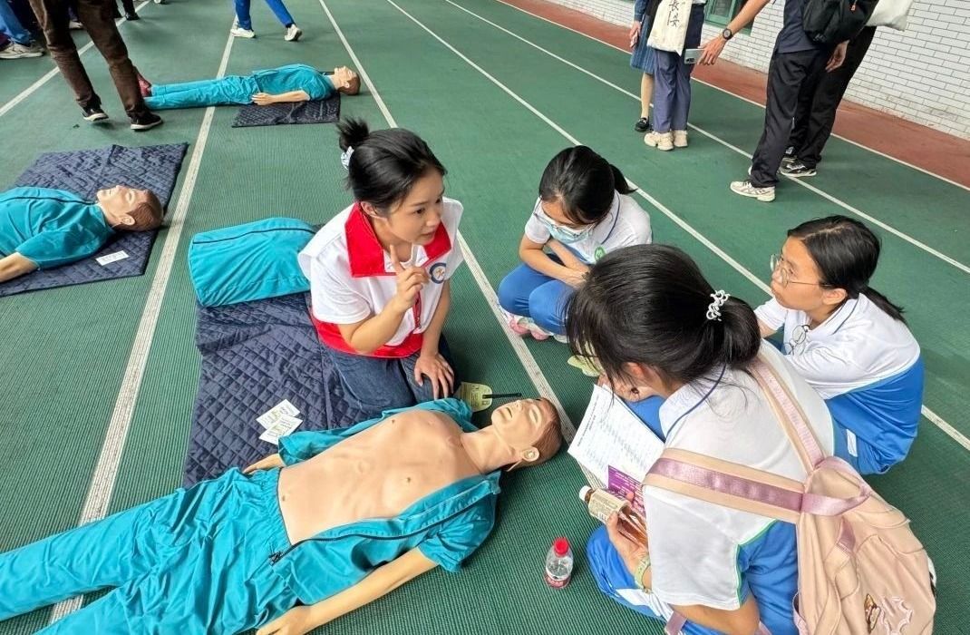 在实操训练阶段,60多名佛山一中的学生参与了模拟人体练习。科普团队采取“手把手指导+实时反馈”的教学模式,针对按压姿势、施救节奏等关键环节进行纠正。现场“手臂打直”、“01、02、03”的指导声此起彼伏,形成沉浸式学习场景。完成5个循环操作后,不少同学感慨,看似简单的动作实则需要充沛体力与高度专注,在亲身体验中既感受到医学专业的严谨性,更领悟到生命守护的重要意义。