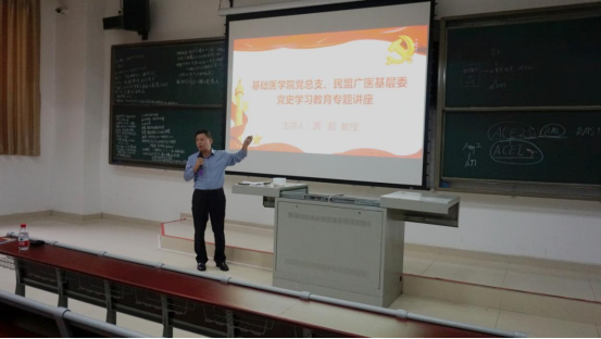 党总支特邀学校党委党史学习教育宣讲组成员龚超教授作专题讲座。讲座由党总支书记龙大宏同志主持,学院领导、全体党员、各系室主任、民盟广医基层委盟员等近200人参加。