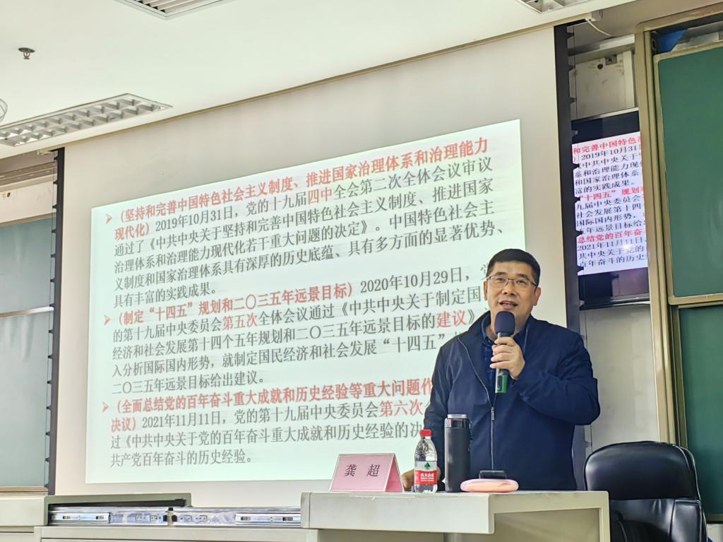 龚超教授以“过去五年的工作和新时代十年的伟大变革”为主题,围绕党的二十大报告第一部分内容,理论联系实际,综合运用案例阐释、数据剖析等方式,对党的二十大精神进行了深入解读。龚超教授的报告视野宏阔、主题鲜明、分析透彻、深入浅出,为我们深刻领会和准确把握党的二十大精神提供了有力指导。