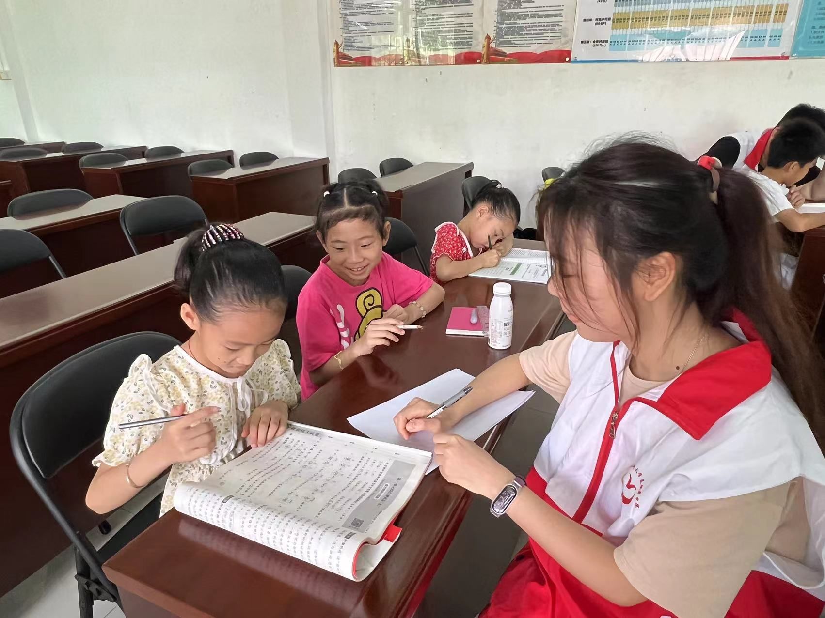 活动中,小朋友们将不懂的知识点和作业向志愿者请教,志愿者们发挥各自所长,一一耐心详细解惑。每组的志愿者和小朋友都十分投入。