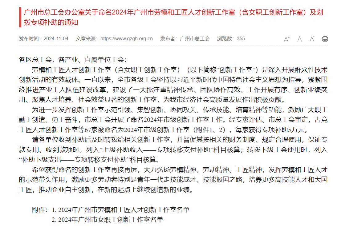 背景介绍:为进一步发挥创新工作室示范引领、集智创新、协同攻关、传承技能、培育精神等功能,激励广大职工勤于创造、勇于奋斗,广州市总工会于2024年7月开展了命名2024年市级创新工作室工作。经专家评估、市总工会审定,67家工作室被命名为2024年市级创新工作室,每家获得专项补助5万元。