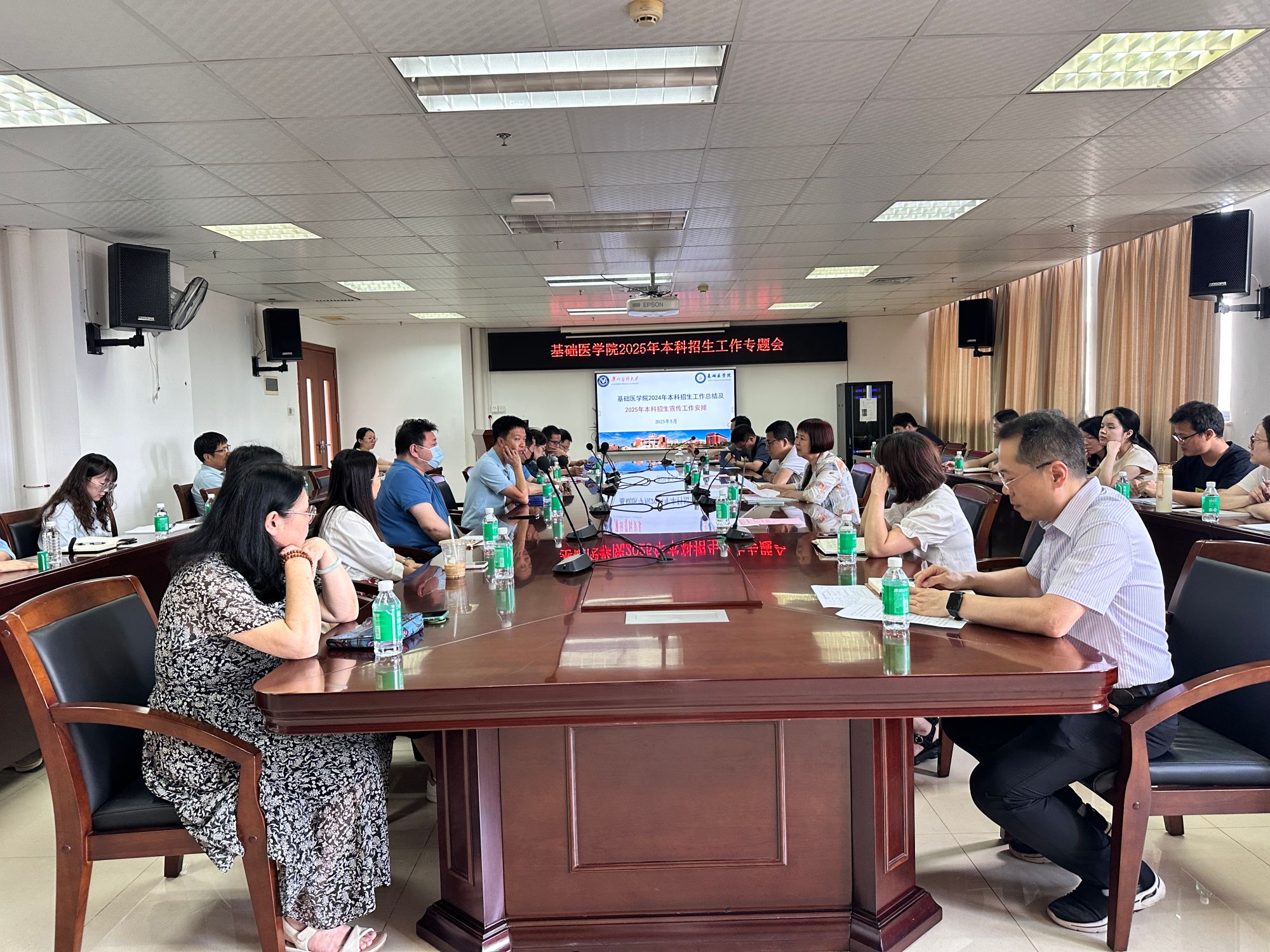 召开2025年本科招生工作专题会议。学院领导班子、各办公室主任、基础医学系主任及本科招生宣传教师团成员约40人参会,会议由学院党委书记尹梅主持。