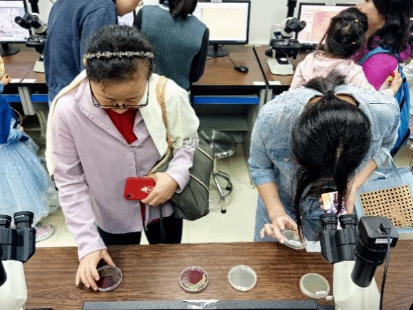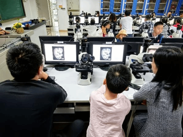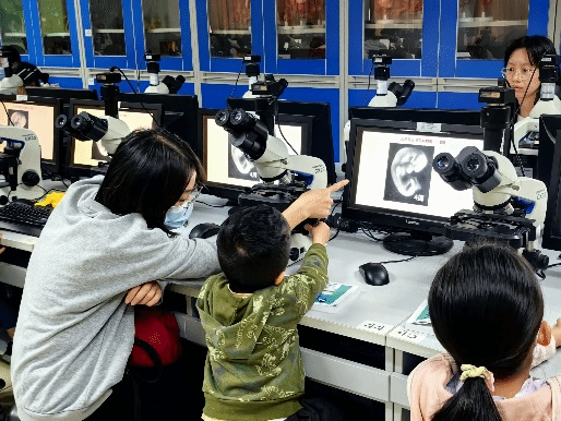 随后,家长和小朋友了解了人体结构的常用方法,通过在显微镜镜下观察和数字切片,探寻人体结构的微观构成;观察各种不同形态的细胞,探索人体丰富多彩、千姿百态的微观世界,在孩子们幼小的心灵里种下医学研究的种子。