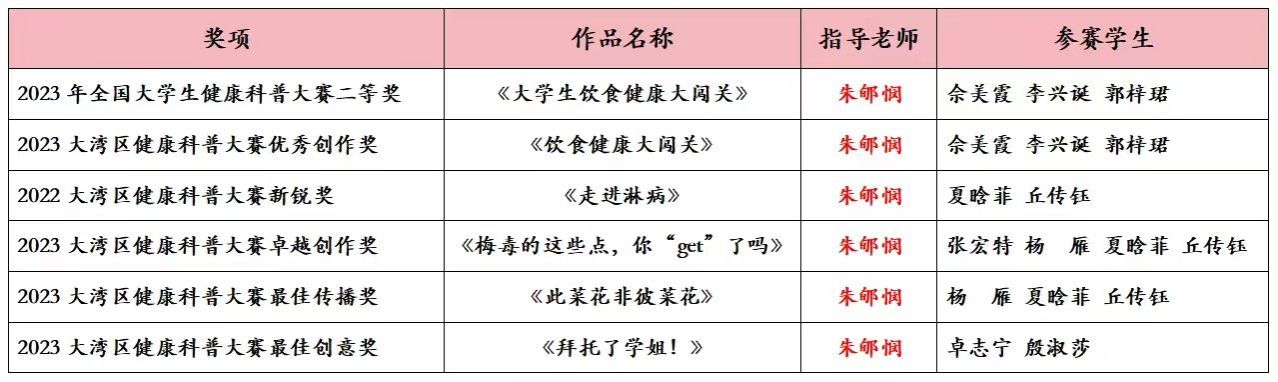 在近期举办的全国大学生健康科普大赛和大湾区健康科普大赛中,我院朱郇悯老师指导学生队伍参赛并获奖6项。获奖作品使用通俗易懂的词汇和构思新颖的表现手法,生动活泼地展示了疾病的原理及危害,深入浅出地帮助社会大众理解复杂的医学知识,有助于科普教育通俗化、普适化。