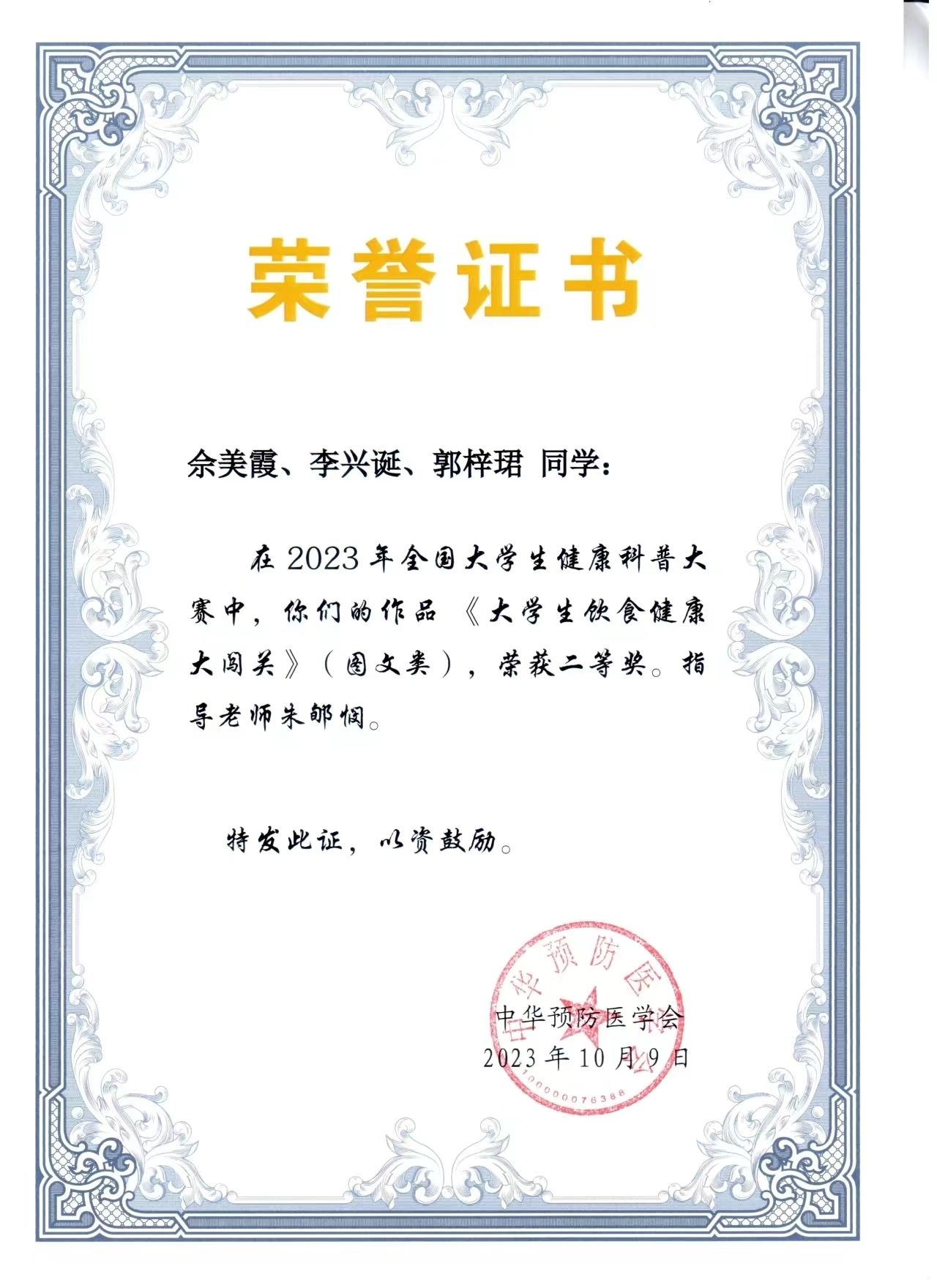 朱郇悯老师指导学生获2023年全国大学生健康科普大赛二等奖