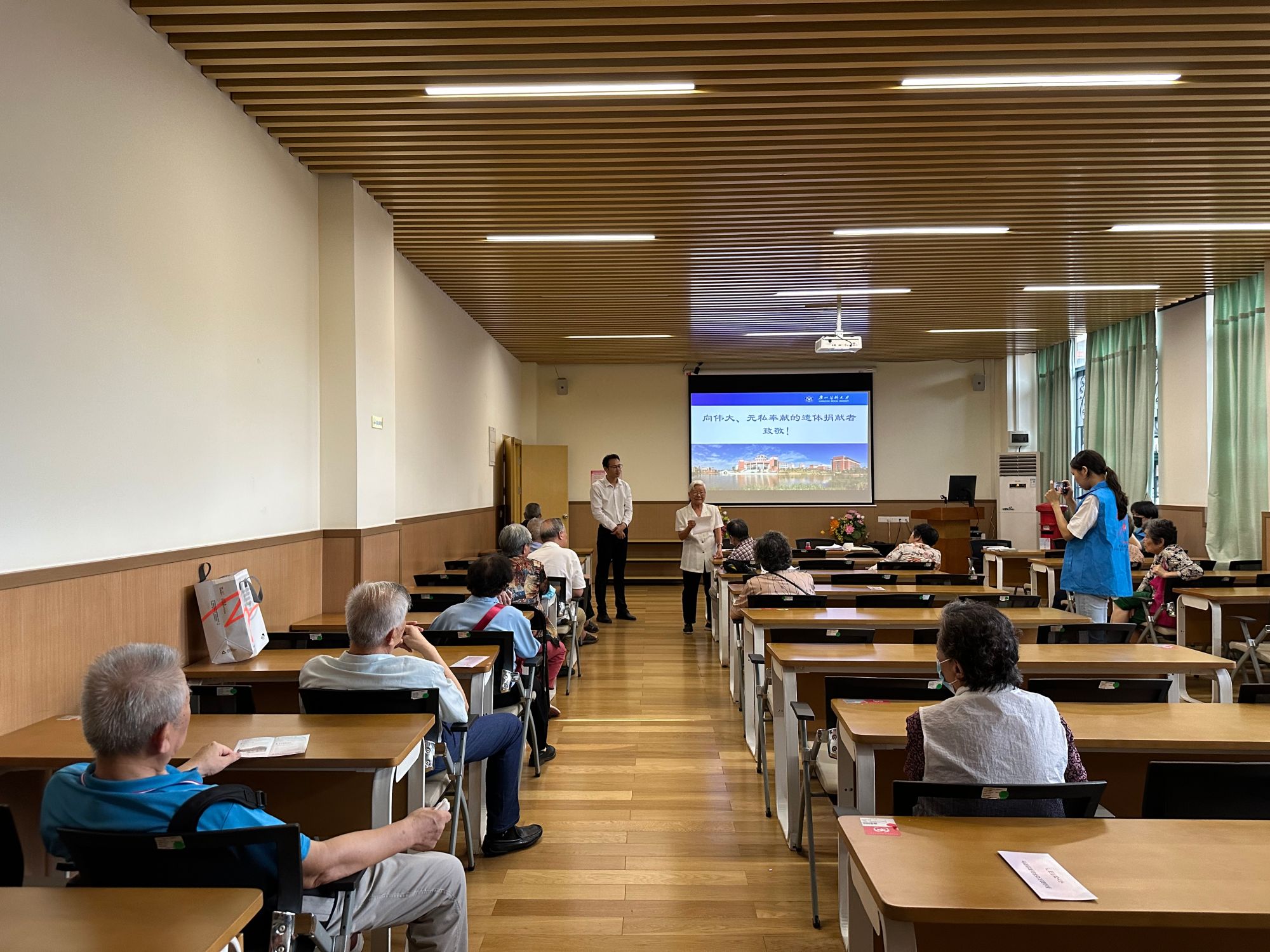 遗体捐献接受站刘建军老师向在场的30多位长者详细回顾了遗体捐献接受站自2006年建立以来,所开展的各项感恩、缅怀活动。随后,在互动交流环节中,长者们积极发言,分享自己对于遗体捐献的看法和感受。其中,一位年逾九旬的广东药科大学退休老师黄教授表示,遗体捐献是一项伟大的创举,是推动医学教育的基石。在党和国家的培养下,她将一生奉献给教育事业。遗体捐献是自己能够为党和国家所作的最后一次贡献,对自己而言,这是一种无上的荣耀。
