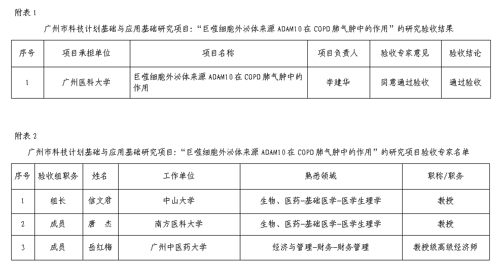 2.广州市科技计划基础与应用基础研究项目: “巨噬细胞外泌体来源ADAM10在COPD肺气肿中的作用”的研究项目验收专家名单