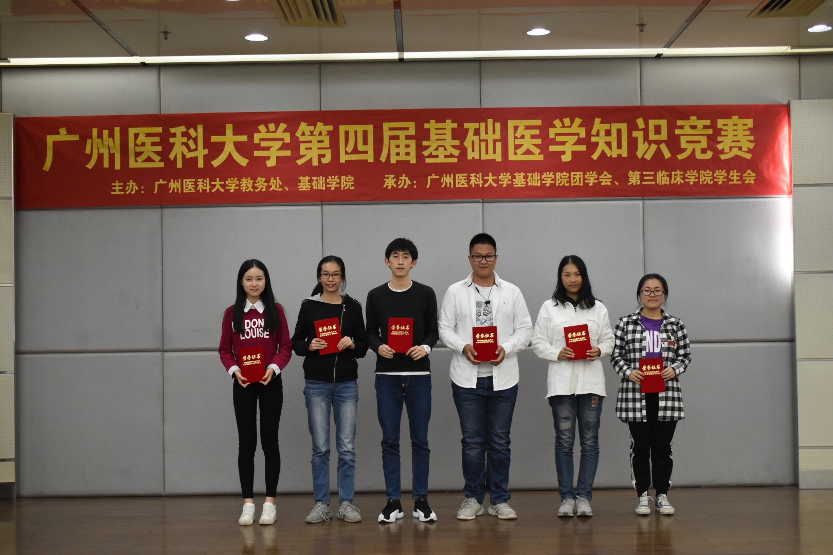 越秀校区10栋学术报告厅隆重举行。本次竞赛由基础学院主管教学的副院长章喜明、朱文渊、王红艳、张雪雁、赵绅婷老师担任评委。由廖武琼、陈庆梓老师和劳嘉鸿、林思思同学担任主持人。第一临床学院岑青燕带领的“大智若愚”队和儿科学院郑婉祺带领的“十二”队共享一等奖。