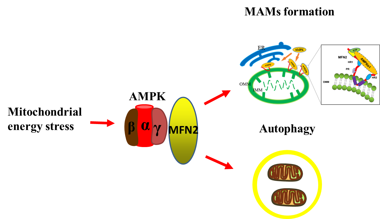 蛋白质修饰与降解广东省重点实验室冯杜教授领衔的自噬研究团队,在《Autophagy》(2018 IF:11.059)发表题为“The AMPK-MFN2 Axis Regulates MAM Dynamics and Autophagy Induced by Energy Stresses”的研究论文。该研究发现介导线粒体融合的蛋白MFN2与细胞能量感受器AMPK之间存在相互作用,并进一步研究了AMPK-MFN2互作在线粒体呼吸链受到胁迫下,细胞启动自噬以及线粒体相关内质网膜结构区域(Mitochondrial-associated Membranes,MAMs)发生动态变化的机理。细胞器膜接触(Membrane Contacts)为细胞器之间搭建桥梁,建立通讯,行使功能。目前这一领域已成为国际热点,为此,国家自然科学基金委会专门启动了“细胞器互作网络及其功能研究重大研究计划”,以确立我国在这个领域的地位。