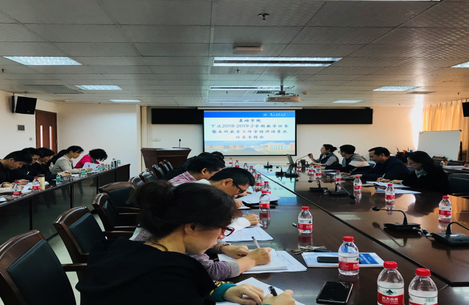 2018年11月22日上午10时,基础学院2018-2019-2学期教学任务暨本科教学工作审核评估整改任务专题会在番禺校区A1-602会议室召开。参加会议人员有:各系、科室主任与教学秘书。会议由基础学院副院长章喜明主持,马宁芳院长出席会议。