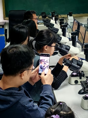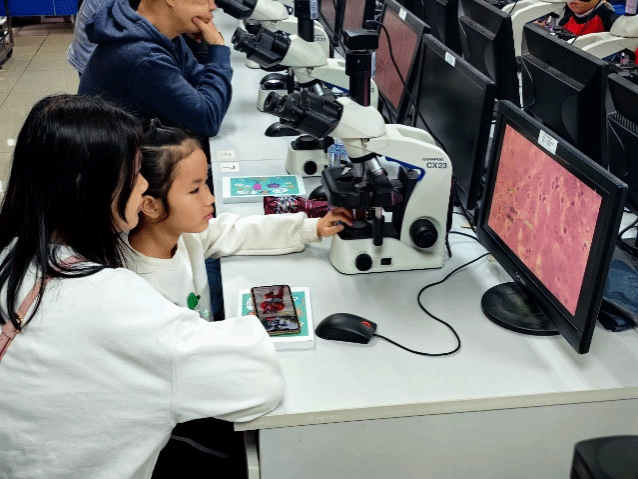 随后,家长和小朋友了解了人体结构的常用方法,通过在显微镜镜下观察和数字切片,探寻人体结构的微观构成;观察各种不同形态的细胞,探索人体丰富多彩、千姿百态的微观世界,在孩子们幼小的心灵里种下医学研究的种子。